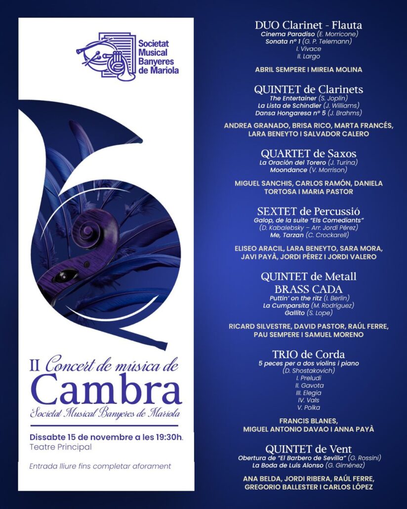 La segona edició del Concert de Cambra representa per a la Societat Musical Banyeres de Mariola una nova oportunitat per mostrar el treball, la dedicació i el talent dels nostres músics. Ens sentim molt satisfets de continuar donant vida a aquest projecte.